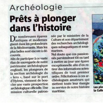 reprise du sondage de l'épave de la Grande Passe en septembre 2020 sous la direction d’Alex Sabastia, archéologue et membre du club car il n'a pu être réalisé en 2019 L'equipe de plongeurs classés participera aussi à la prospection organisée en partenariat avec le Parc National de Port Cros afin de rechercher l'algue "caulerpa taxifolia" dans les eaux de Porquerolles, Port-Cros et Bagaud