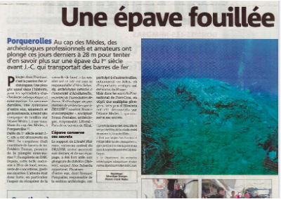 L’épave Mèdes 6, découverte en 2010 dans la rade d’Hyères par 44 m de fond, transportait une cargaison d’amphores Dressel 1C datées de la fin du IIe siècle av. J.-C. Elle a fait l’objet de campagnes de fouilles jusqu’en 2015, ayant permis de mettre au jour une partie des vestiges de la coque. Au terme de l’étude, l’épave s’inscrit dans un corpus daté du IIIe siècle av. J.-C. au IIe siècle apr. J.-C., dont l’assemblage des membrures sur le bordé est réalisé au moyen de ligatures internes. pour lire la suite, consultez l'article de Alex Sabastia si dessous https://stoechades.hypotheses.org/les-epaves/medes-6